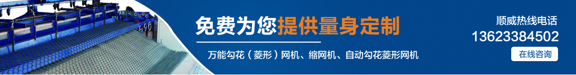安平縣順威絲網(wǎng)機(jī)械設(shè)備制造有限公司自產(chǎn)自銷,省去中間環(huán)節(jié),讓利給客戶,真正的讓您省錢。主要產(chǎn)品有:萬(wàn)能勾花(菱形)網(wǎng)機(jī)、縮網(wǎng)機(jī)、自動(dòng)勾花菱形網(wǎng)機(jī)、全自動(dòng)勾花菱形網(wǎng)機(jī)。 |